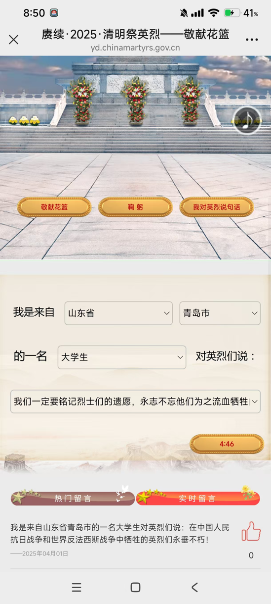 为传承革命传统、赓续红色血脉、厚植爱国情怀,推进党史学习教育常态化,4月2日,九游体育官方网站第四(学生)党支部开展“赓续·2025·清明祭英烈”清明节线上祭扫主题党日活动。