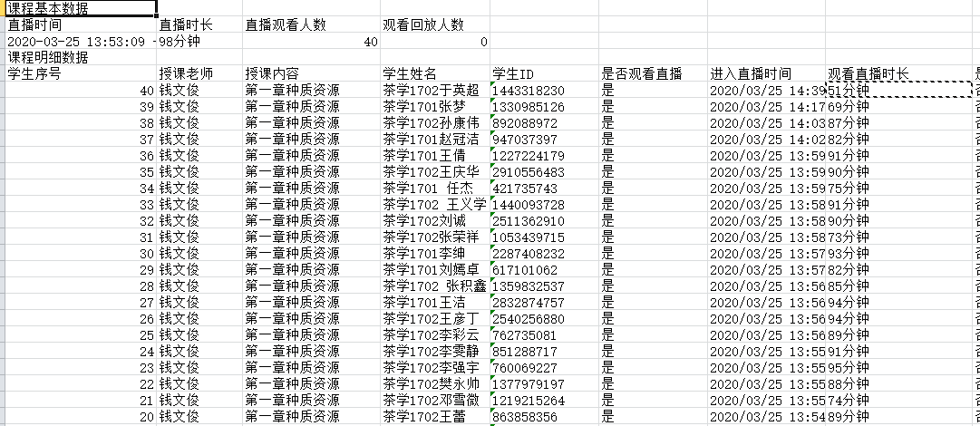 在腾讯课堂app中具有查看考勤记录功能,能够知道有多少人上课,可以根据每人观看直播的时长数,来判断是否认真听讲了(图6),能够准确,实时确定一堂课听讲的学生人数和时长。