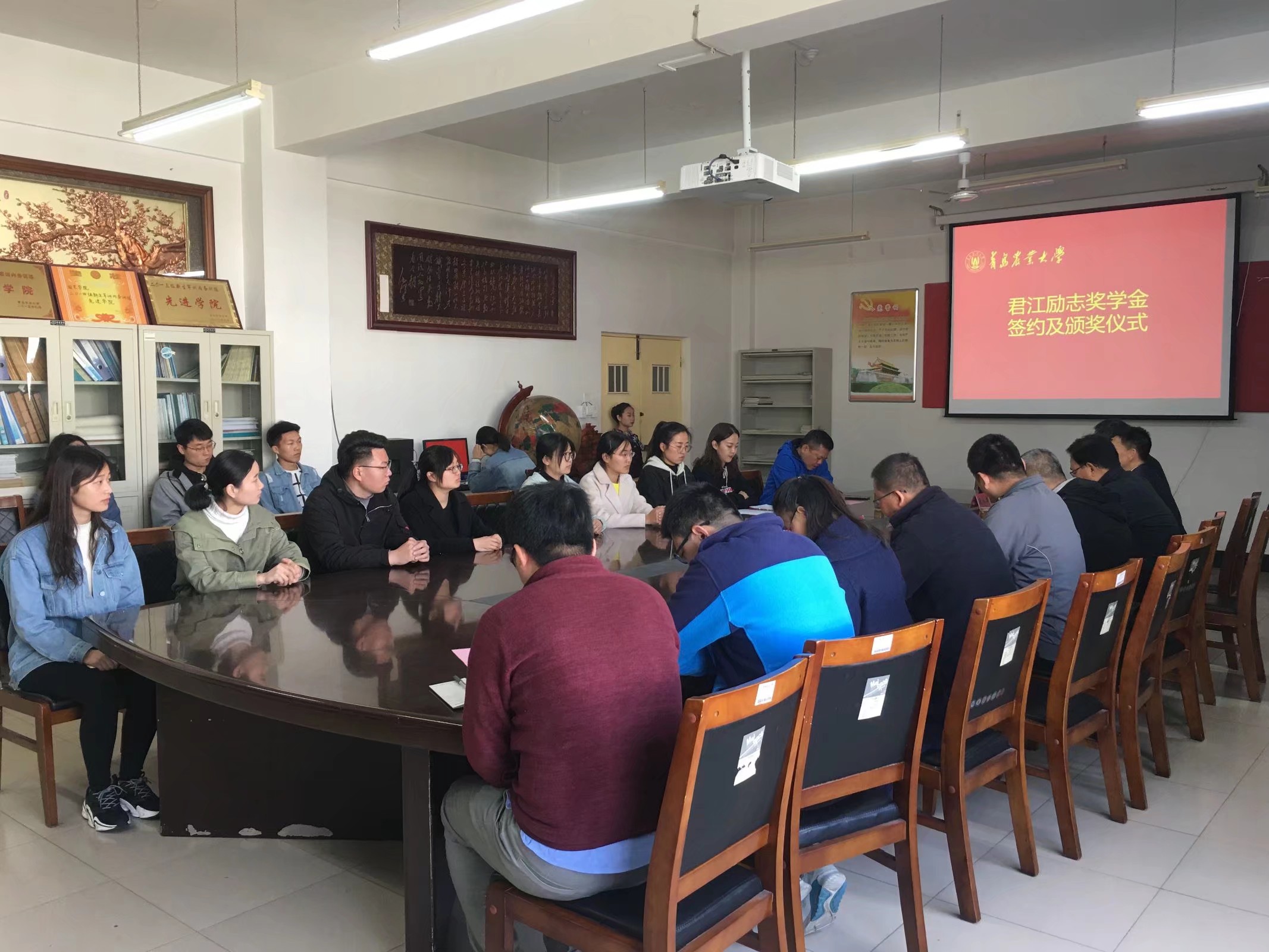 首先,九游体育官方网站党委书记隋成竹与上海君江科技董事长孙君同签订了“君江励志奖学金”协议。王春晓宣读了励志奖学金获奖名单,孙君同向获奖学生颁发证书。仪式上,茶学1702班宋宇杰代表全体获奖学生做出四点承诺:树立远大理想,不断追求进步;热爱科学、追求真理,继续努力学习;积极进取、乐观自信,培养健康的心理;知恩图报,不忘学校的培养之恩。随后,孙君同向获奖学生表示祝贺,并向同学们分享了他的学习工作经历。他强调了学习的重要性,并希望同学们能够主动学习,做到知行合一,掌握扎实的专业知识和实践能力,努力形成“专业、产业相互促进”的共赢局面,以优异的成绩回馈社会。