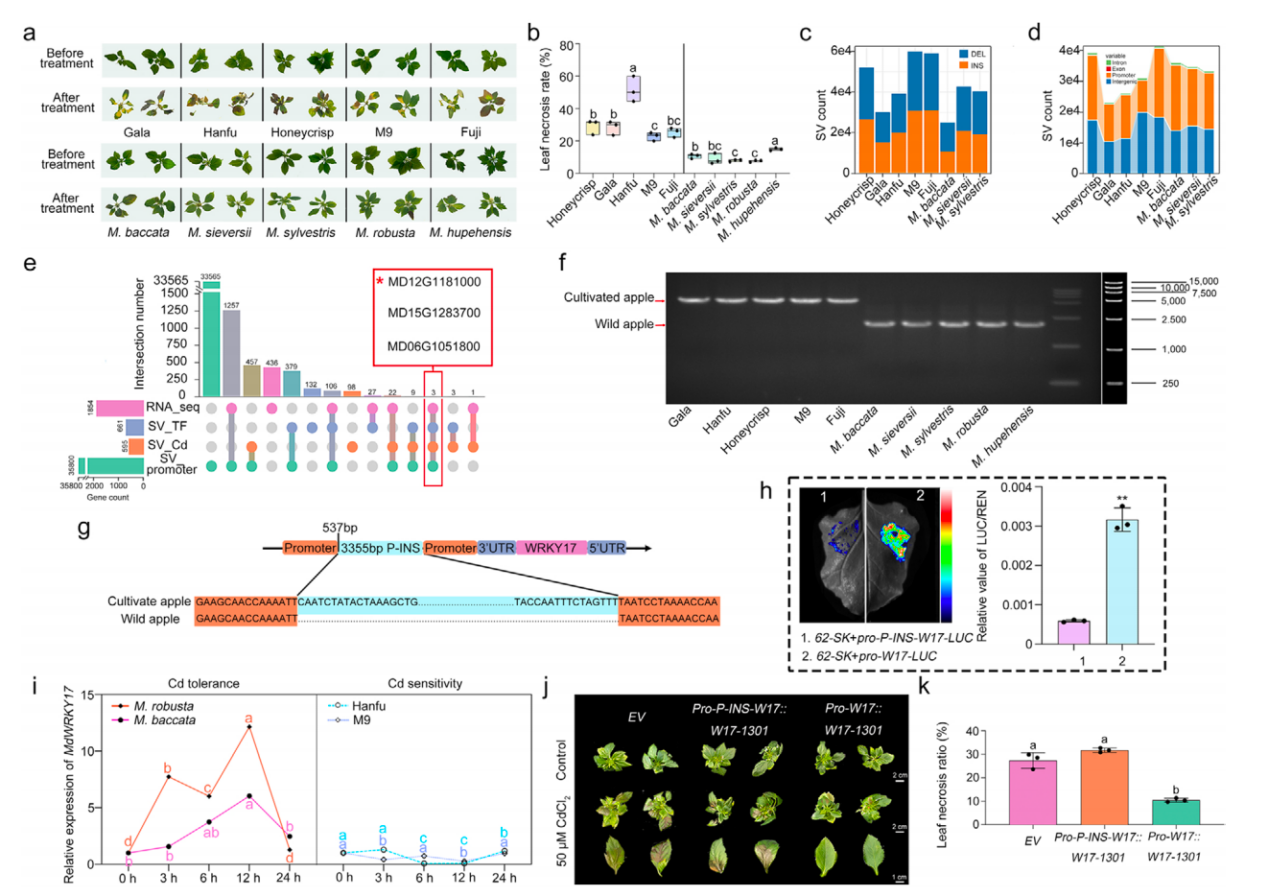 研究团队对三个野生苹果(山丁子、新疆野苹果和森林苹果)以及五个栽培苹果(‘嘎啦’、‘富士’、‘寒富’、‘蜜脆’和M9)进行了抗镉能力评估和基因组分析,最终锁定WRKY17基因在镉耐受性中发挥核心作用。