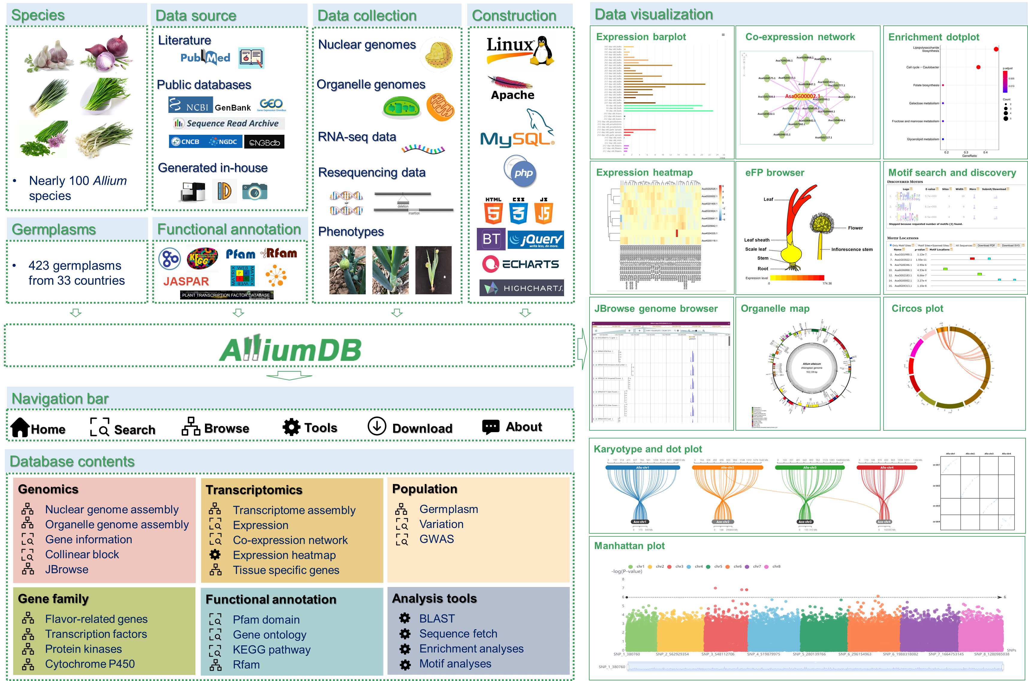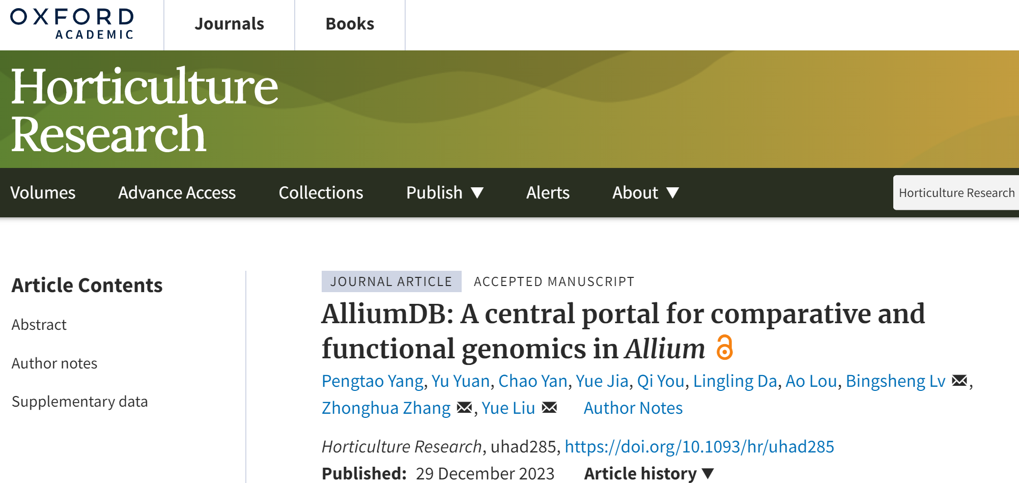 近日,九游体育官方网站大葱分子设计育种创新团队在国际著名期刊Horticulture Research发表题为 AlliumDB: A central portal for comparative and functional genomics in Allium的研究论文。该研究通过整合葱属多个物种的基因组、转录组、变异组、表型组等数据,构建了一个葱属比较基因组学和功能基因组学数据库,为葱属作物遗传育种研究提供了重要的数据资源和分析平台。