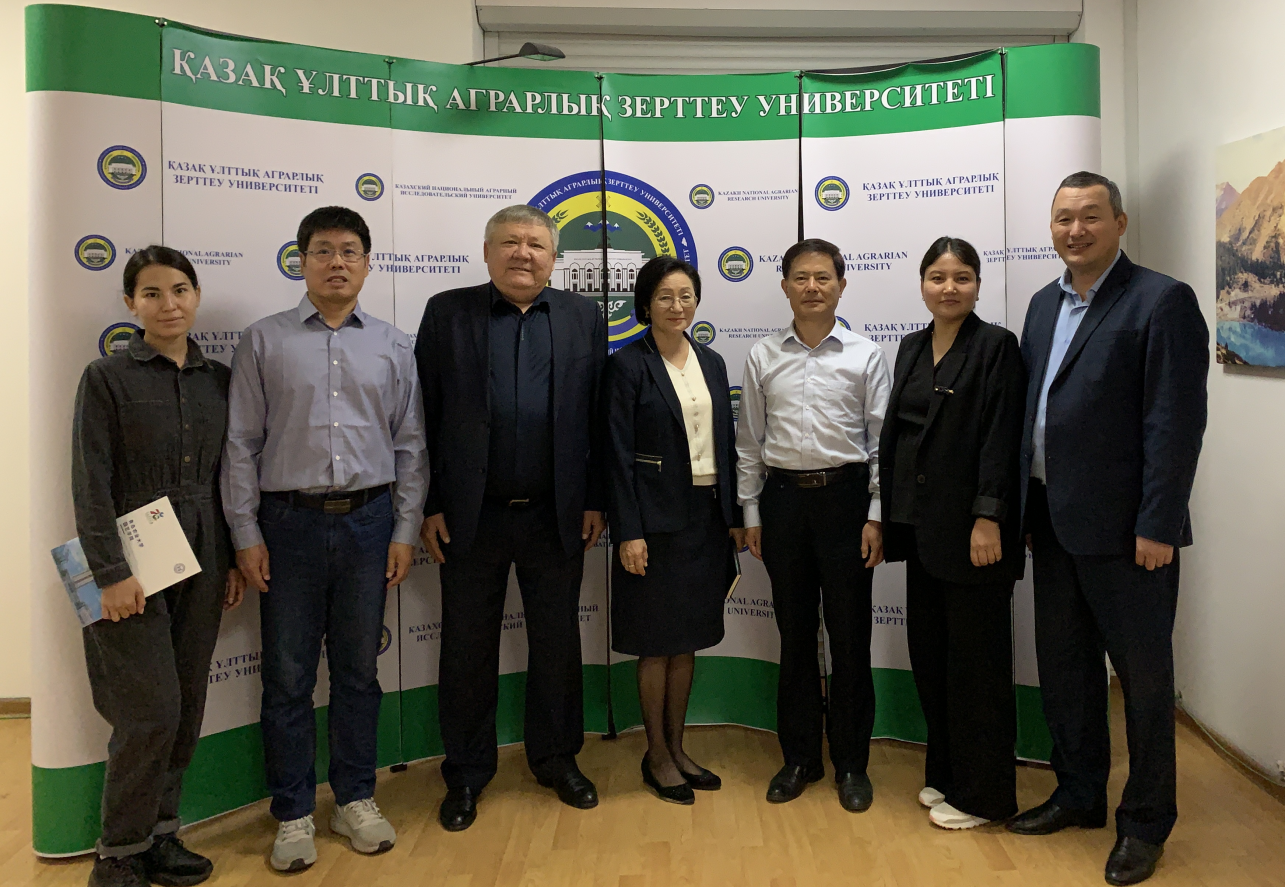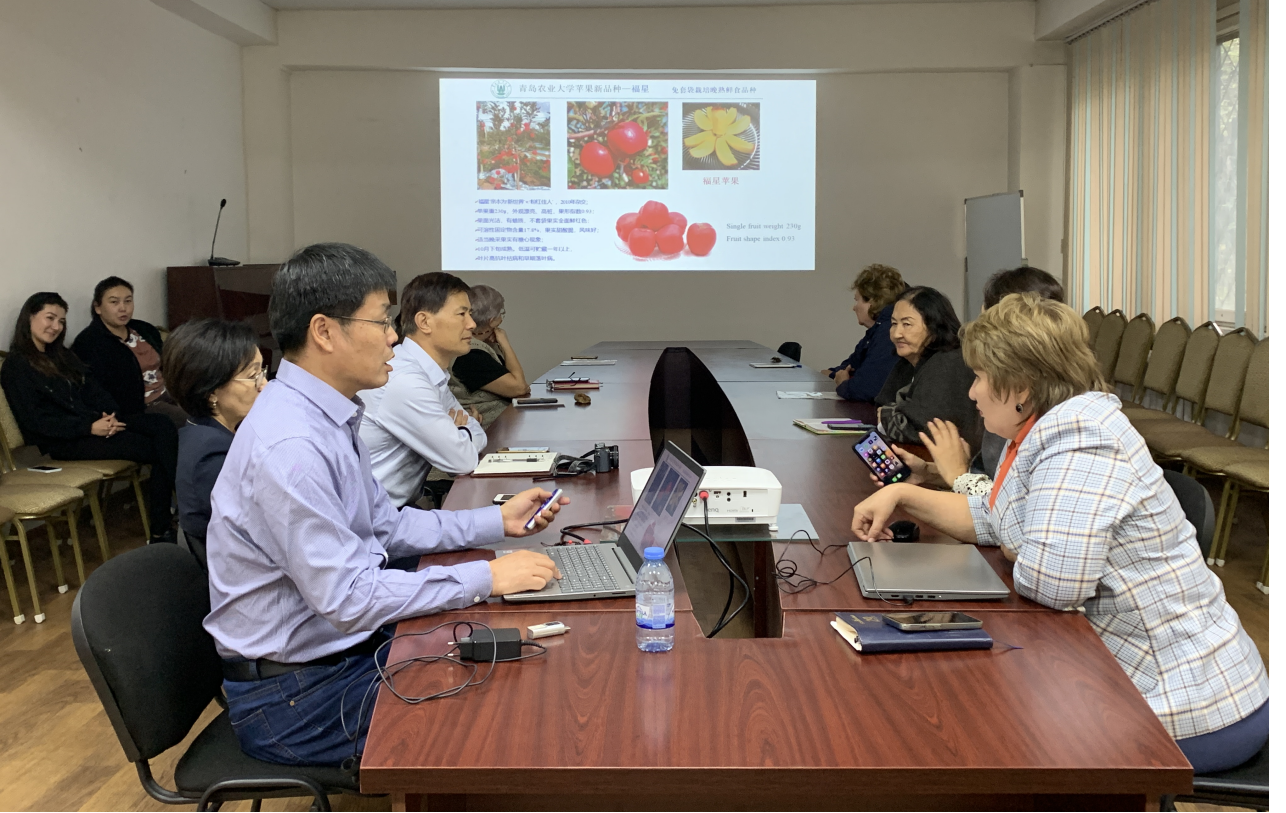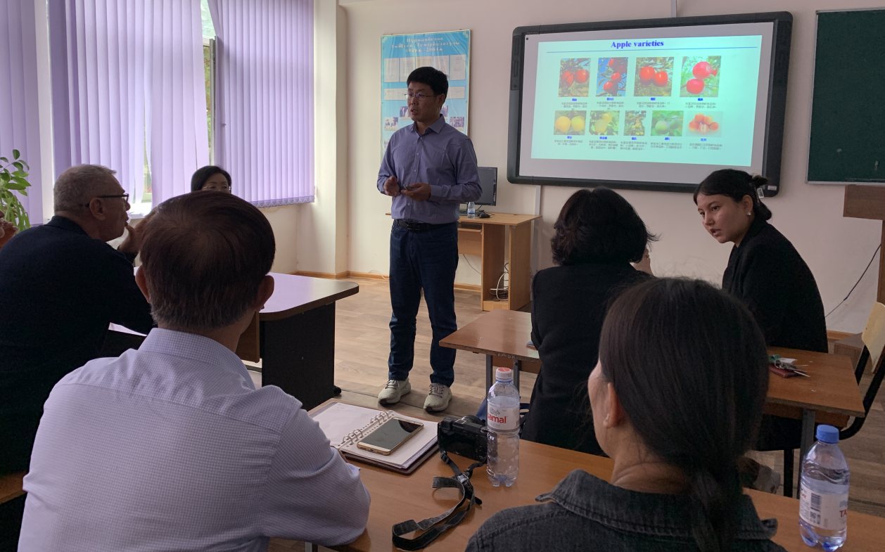 在访问哈萨克斯坦期间,会见了哈萨克斯坦国立农业大学农业生物学学院院长阿比尔达耶夫·叶尔詹(Abildayev Yerzhan)研究员、哈萨克斯坦农科院院士、哈萨克斯坦国立农业大学农业生物学学院园艺系凯罗娃·古尔沙利亚(Kairova Gulshariya)教授、园艺系主任、教研室主任、专业教师以及哈萨克斯坦农科院果蔬所所长、科研人员。围绕苹果野生资源评价与利用以及苹果抗病育种技术进行了交流,讨论了未来的国际合作。张玉刚教授作了“九游体育官方网站苹果抗病杂交育种研究进展”的报告,并参观了该校与日本合作建立的生物技术研究中心实验室、学校实验站和苹果园。