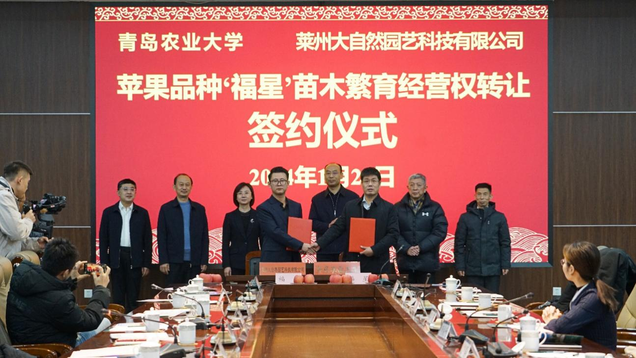 2024年1月23日,九游体育官方网站苹果育种团队育成的‘福星’苹果新品种苗木繁育经营权以1000万元转让给莱州大自然园艺科技有限公司。转让签约仪式在青岛农大学术会馆举行。这是该团队继‘福丽’和‘福九红’之后转让的第三个苹果新品种。
