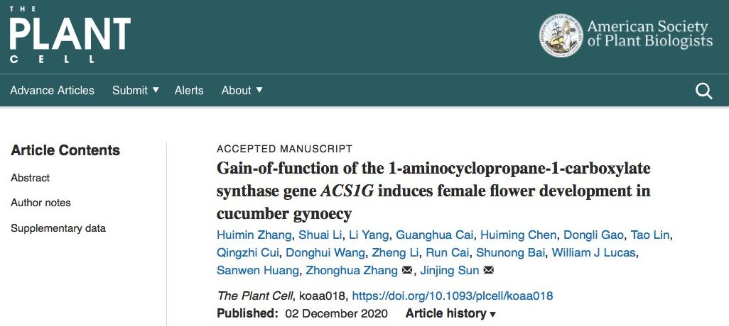 近日,九游体育官方网站张忠华教授和中国农业科学院蔬菜花卉研究所孙进京合作,联合中国农业科学院深圳农业基因组研究所首次发现黄瓜中全雌基因(Female)是获得新功能的基因ACS1G,并深入研究了其作用机制,提出了黄瓜雌花和雄花多样性发育的分子模型。相关研究内容『Gain-of-function of the 1-aminocyclopropane-1-carboxylate synthase gene ACS1G induces female flower development in cucumber gynoecy』于12月2日在线发表于《The Plant Cell》上。