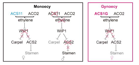 在前期工作的基础上,研究人员利用CRISPR/Cas9基因编辑技术和EMS诱变相结合,首次证实了F基因是ACS1G基因,而不是重复序列中的 MYB 家族转录因子。由于基因组的结构变异,ACS1G获得了不同于雌雄同株材料中ACS1的启动子和新的表达模式,ACS1G在花芽发育早期与 ACO2基因的重叠表达,使ACS1G获得了决定雌花形成的功能。由于ACS1G 基因在早期花芽中的表达不像 ACS11一样具有选择性,所以所有花芽都发育成雌花,这也解释了F基因上位于隐性全雄基因(androecious)的原因。