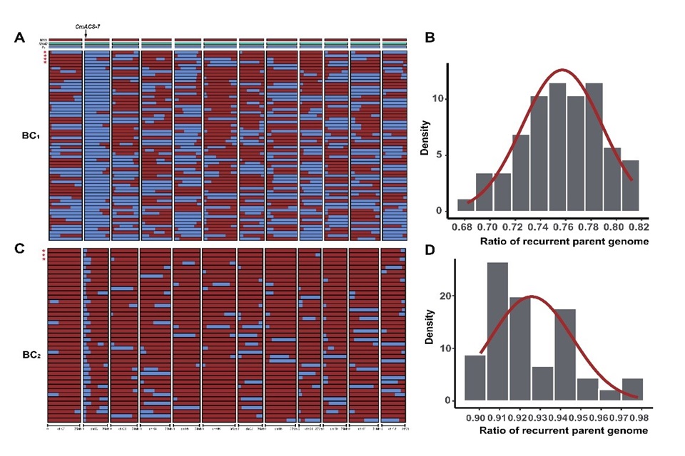 在回交育种过程中,利用Melon2K液相芯片进行背景选择,结合前景标记筛选,仅通过两轮回交就可以获得背景恢复率超过97%的导入系,显著缩短了育种周期,提高了育种效率。
