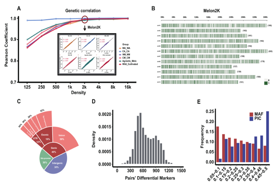 为此,研究团队开发了一款甜瓜2K液相芯片Melon2K。数据来源基于823份世界范围内代表性甜瓜种质的800多万个SNP位点,筛选并评估了8套不同密度的SNP集合(16K,8K,4K,2K,1K,500,250 和125),综合考虑位点多态性、序列保守性、基因组覆盖完整性以及开发成本等方面,最终选择了2K SNP集合用于液相芯片合成。在测试样本中Melon2K位点检出率平均为99.8%,最小等位基因频率均值为0.24,两两个体间平均差异位点数为684个。