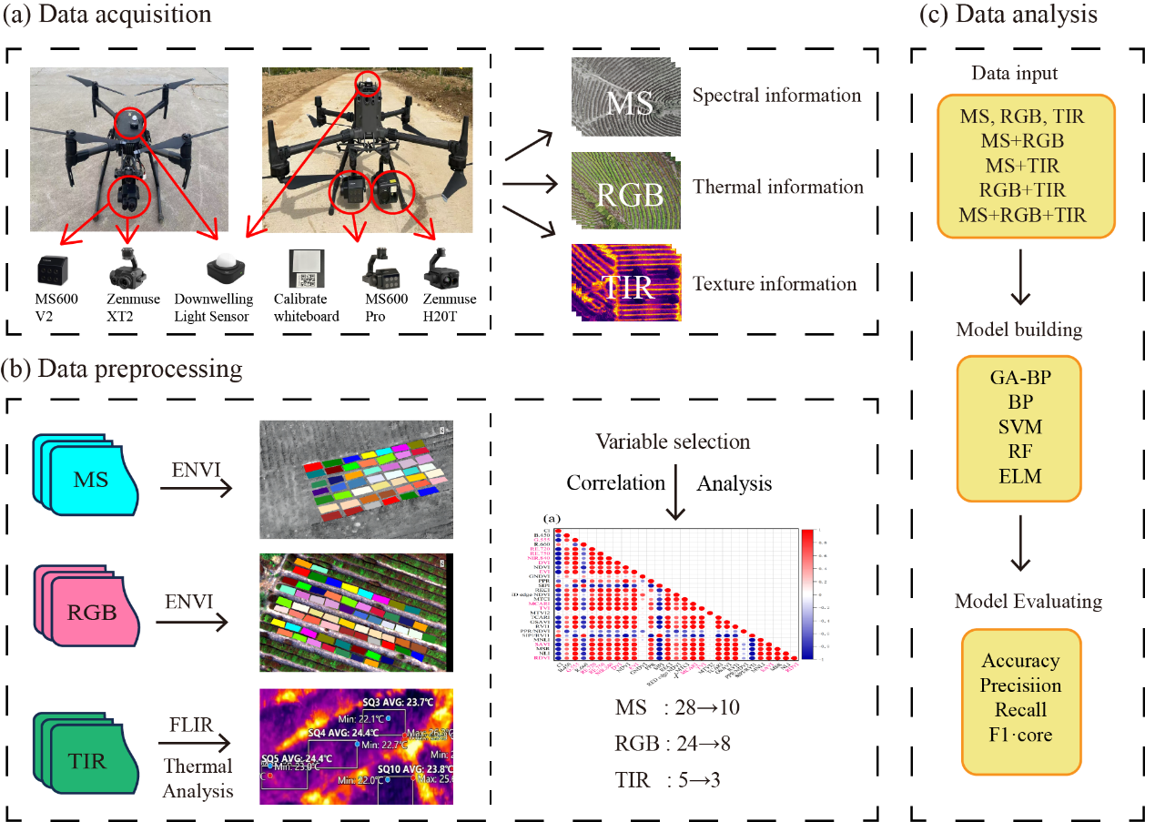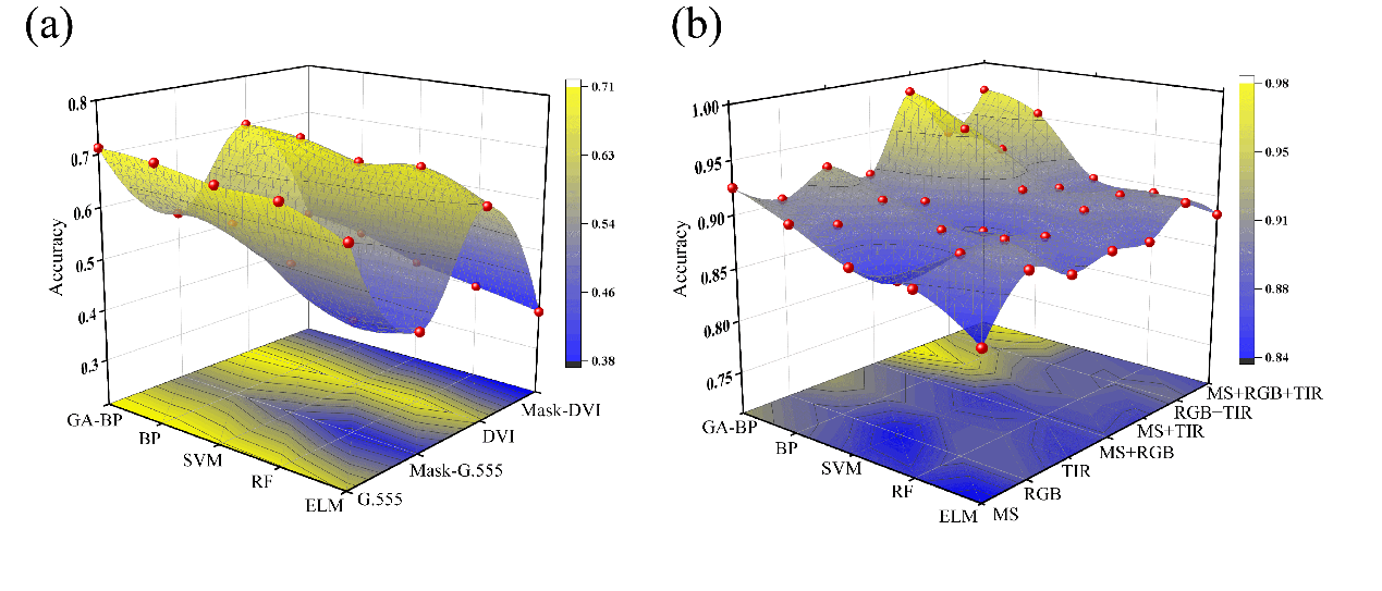 研究中,团队成员提出了RSDCM(基于遥感的干旱分类模型),一种改进的遗传算法-反向传播(GA-BP)结合MS + TIR框架,通过遗传算法的全局搜索优化初始权重和阈值(隐藏层=1,隐藏层中的神经元=5,50代,群体大小=5,NonUnifMutation算子)来避免局部最小值并加速收敛。一个配备MS,RGB,TIR传感器收集了来自干旱的多源数据,将RSDCM模型与单一BP算法和三种经典的机器学习模型(SVM、RF、ELM)进行了对比。