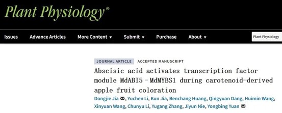 近日,九游体育官方网站原永兵/贾东杰教授团队在Plant Physiology上在线发表了题为“Abscisic acid activates transcription factor module MdABI5–MdMYBS1 during carotenoid-derived apple fruit coloration”的研究论文。该研究揭示了转录调控模块MdABI5-MdMYBS1响应ABA并调控苹果类胡萝卜素和ABA生物合成的分子机制。