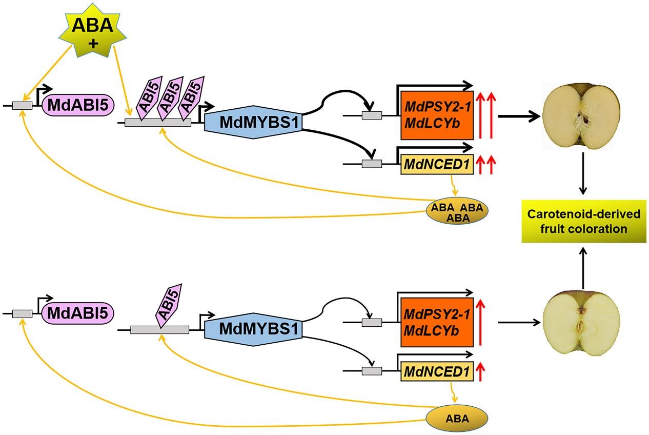 综上,该研究揭示了转录调控模块MdABI5-MdMYBS1在类胡萝卜素介导的果实着色和ABA生物合成的调控模式和作用机理。该研究为构建苹果果实类胡萝卜素和ABA生物合成的分子调控网络、改良果实着色和品质等具有重要意义。