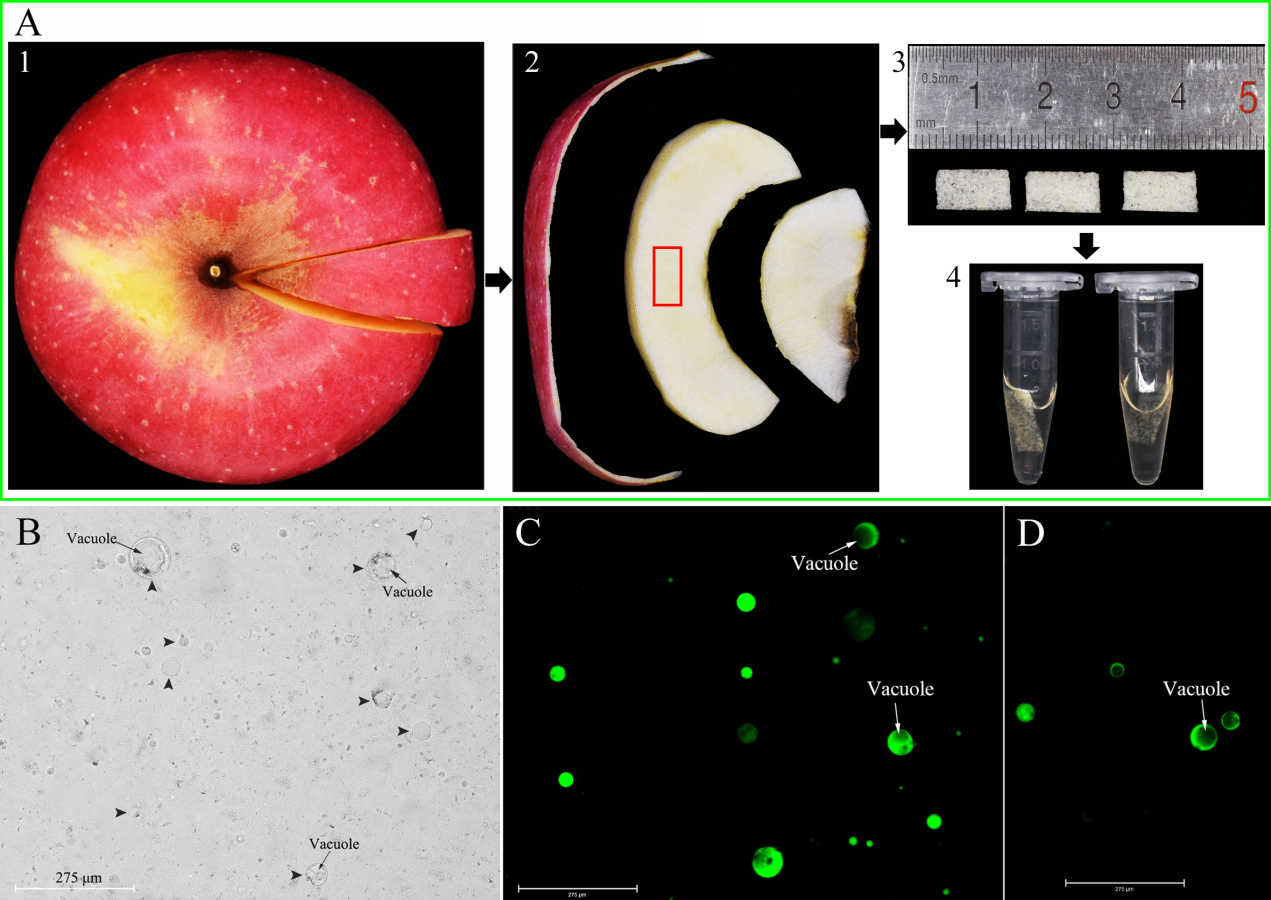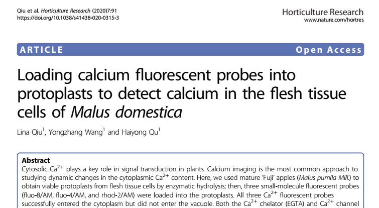 2020年6月,九游体育官方网站果树生理与栽培课题组在园艺领域顶级期刊Horticulture Research(一区)在线发表了题为“Loading calcium fluorescent probes into protoplasts to detect calcium in the flesh tissue cells of Malus domestica”的研究论文。该论文首次发现Fluo-8/AM等小分子荧光探针可以染色苹果果肉胞质中的Ca2+,可用于检测细胞质中Ca2+的时空变化。九游体育官方网站硕士研究生仇丽娜为本论文第一作者,九游体育官方网站王永章教授和屈海泳副教授为论文的共同通讯作者。该论文得到了国家重点研发计划项目(2016YFD0201120)的资助。