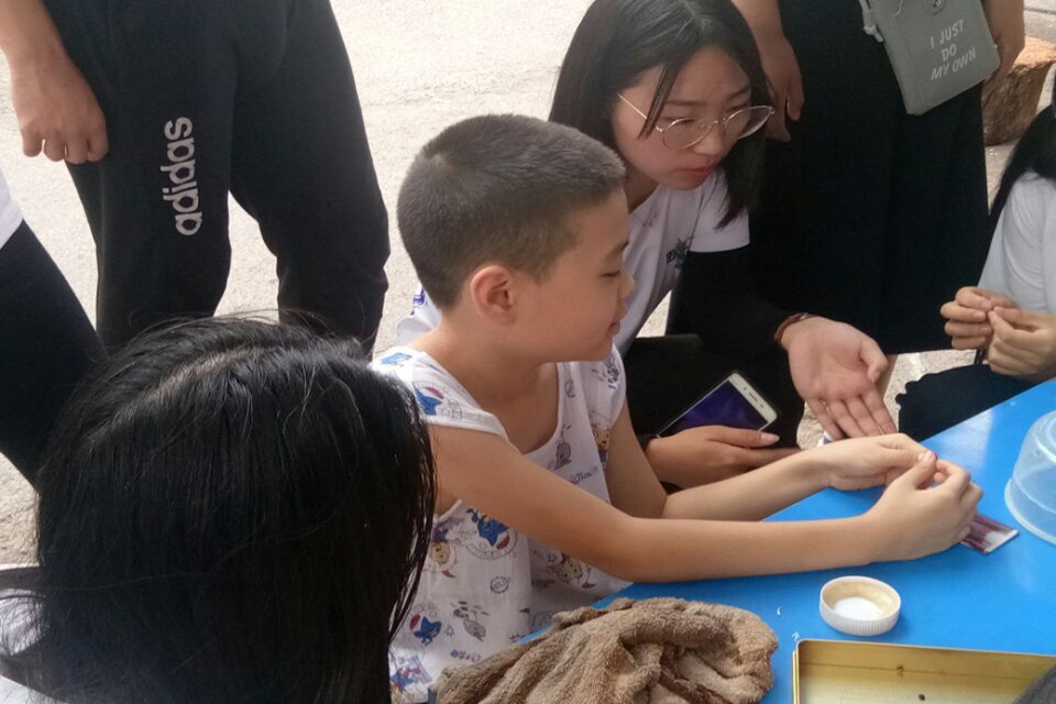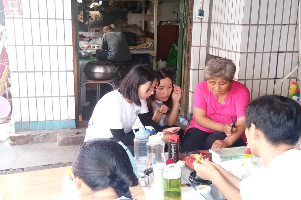 队员们正在向高桂英老人的小徒弟请教捏面塑的经验 通讯员 王景涵 摄