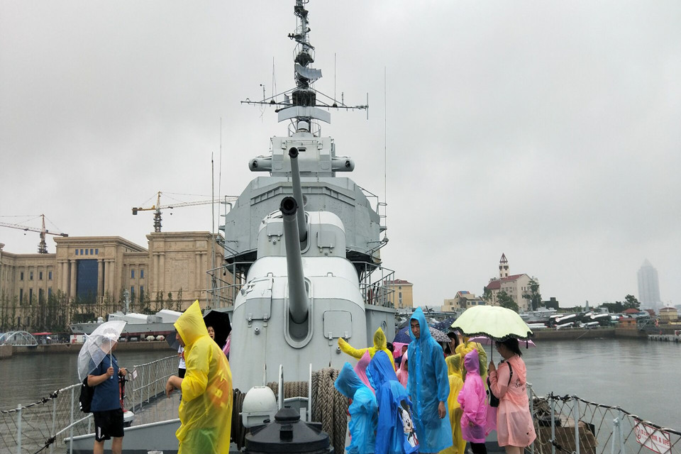 最让我们感到震撼的是停泊在岸边的“鞍山”号驱逐舰和“济南”号导弹驱逐舰,看着浩浩荡荡的两艘战舰,队员们按耐不住激动的心情,登上军舰,近距离观察它们。“鞍山”号性能优良、曾为保卫祖国做过重大贡献,是一条具有光荣战绩的军舰,在我国的海军历史上留下了浓墨重彩的一笔。登上战舰,领略的又是另一番风景。不少游客在军舰驻足,既有正在向自己的家人讲述着战舰历史的老人,也有带着孩子感受海军精神、上一堂生动的历史课的家长。