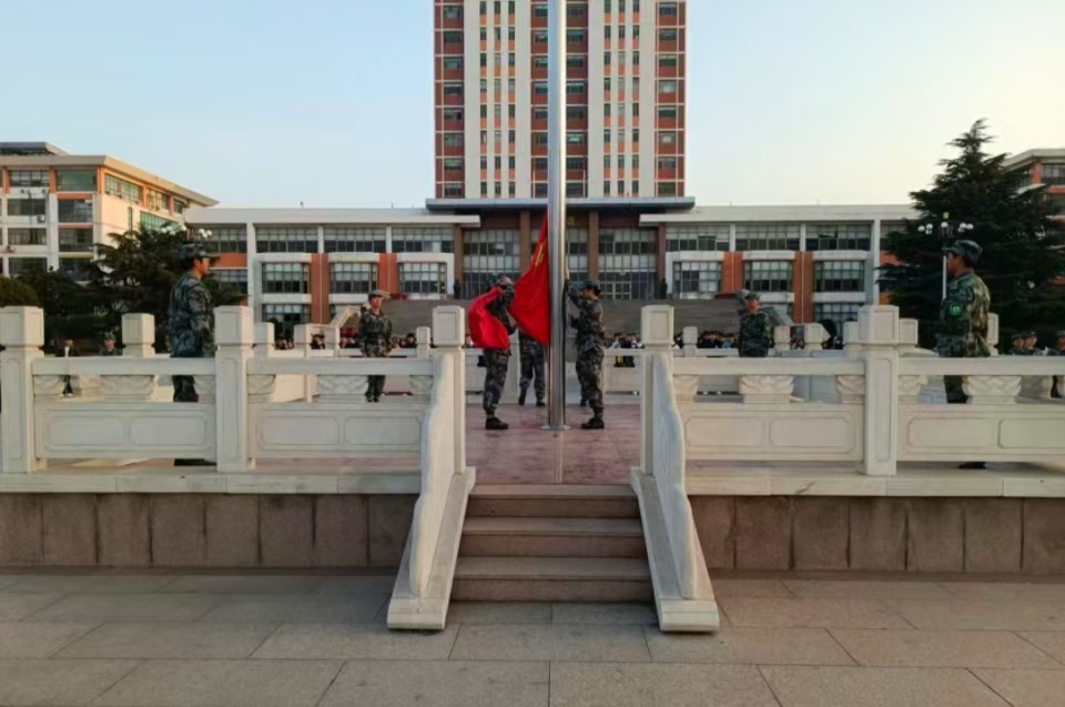 迎着初升的太阳,国旗护卫队昂首挺胸,迈着整齐划一的步伐护送国旗入场。在庄严的《义勇军进行曲》中,五星红旗冉冉升起,迎风飘扬。全体师生肃立注目,齐声高唱国歌。