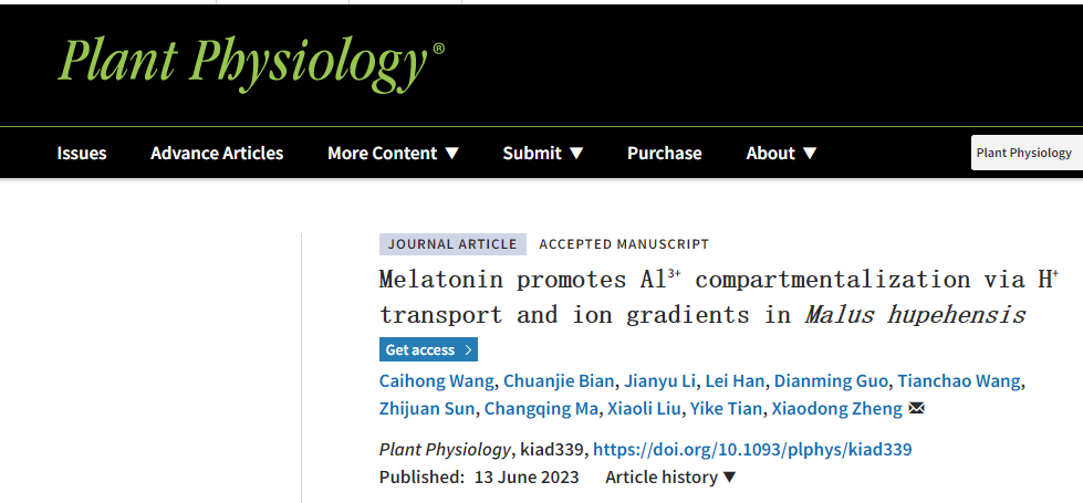 2023年6月13日,九游体育官方网站王彩虹教授课题组在Plant Physiology(一区Top期刊,IF 8.005)在线发表了题为“Melatonin promotes Al3+ compartmentalization via H+ transport and ion gradients in Malus hupehensis”的研究论文。该研究报道褪黑素通过调控液泡H+/Al3+交换和维持细胞质H+稳态来提高苹果耐铝性,系统揭示了MT-STOP1+NAC2-NHX2/ALS3-vacuolar H+/Al3+的分子调控网络。本研究为提高苹果耐铝性和褪黑素在农业上的应用提供了重要依据。九游体育官方网站郑晓东教授为论文的通讯作者,王彩虹教授和硕士研究生边传杰为论文的共同第一作者,田义轲教授、马长青博士、孙志娟博士和刘晓丽博士等也参与了本研究。