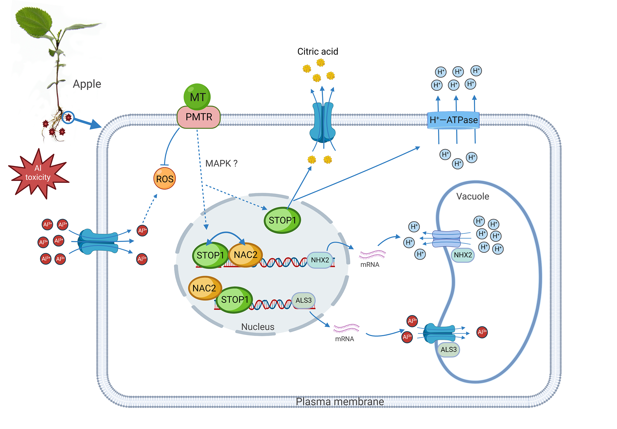 高投入高产出的果园生产模式中化学肥料的过度施用导致苹果产区土壤酸化和铝毒效应日趋严重。褪黑素(melatonin,MT)是一种吲哚杂环类化合物,在调控植物响应非生物胁迫过程中发挥重要作用。目前,MT在苹果响应酸铝胁迫过程中的作用未知。该研究报道MT可通过调控液泡H+/Al3+交换和维持细胞质H+稳态来提高苹果的耐铝性,并通过转录组数据分析筛选出了共响应MT和AlCl3胁迫的关键转录因子SENSITIVE TO PROTON RHIZOTOXICITY 1(MdSTOP1),在苹果中超表达MdSTOP1,同样可通过促进液泡H+/Al3+交换和细胞质中H+的外排来提高苹果对铝胁迫的耐受性。此外,该研究鉴别出了受MdSTOP1调控的下游Al3+转运蛋白基因ALUMINUM SENSITIVE 3 (MdALS3)和H+转运蛋白基因SODIUM HYDROGEN EXCHANGER 2 (MdNHX2)。褪黑素可以通过促进MdSTOP1与转录因子MdNAC2的互作,增强MdSTOP1对MdALS3表达的调控,将细胞质中Al3+转运到液泡中,以减轻细胞受到的铝毒害。同时,MdSTOP1与MdNAC2共调控MdNHX2的表达,通过调控液泡H+的外排形成离子梯度,从而促进Al3+的内流并维持液泡离子平衡。综上所述,该研究结果揭示了苹果MT-STOP1+NAC2-NHX2/ALS3-液泡H+/Al3+交换应答铝胁迫的分子机制,为褪黑素在农业中的应用提供了重要依据。