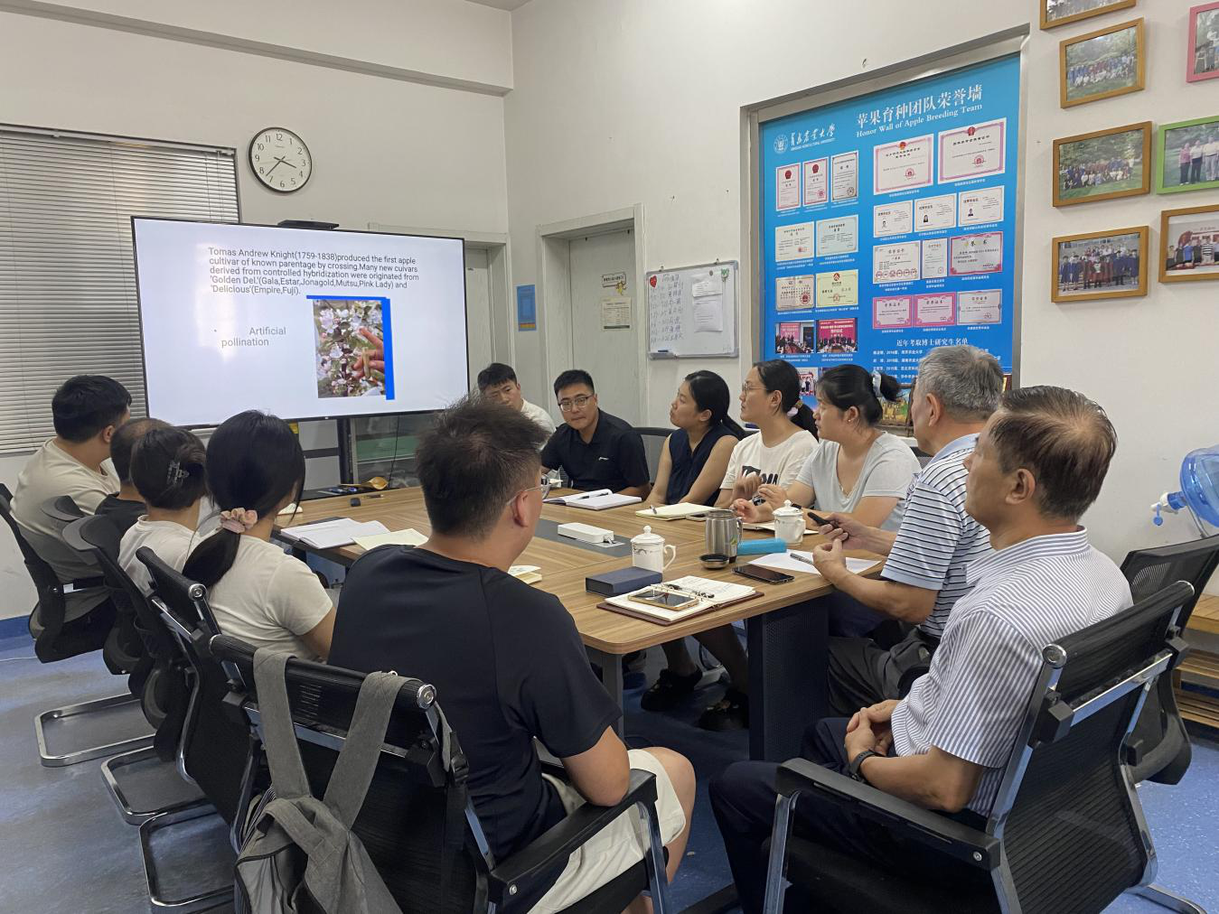 课上,戴洪义教授首先以“育种家的梦想从这里启航”为题,给同学们梳理了苹果育种团队三十年来扎根田间、攻坚克难的发展历程,展示了在抗逆作物品种培育、高产优质种质创新等领域取得的突破性成果;分享了自己科研道路上的经历与心得;勉励同学们传承严谨务实的科研作风,主动培养独立设计试验、分析数据和解决问题的能力,保持对苹果育种事业的热爱,脚踏实地完成研究生阶段的学习与科研任务,为苹果产业的发展贡献自己的一份力量。