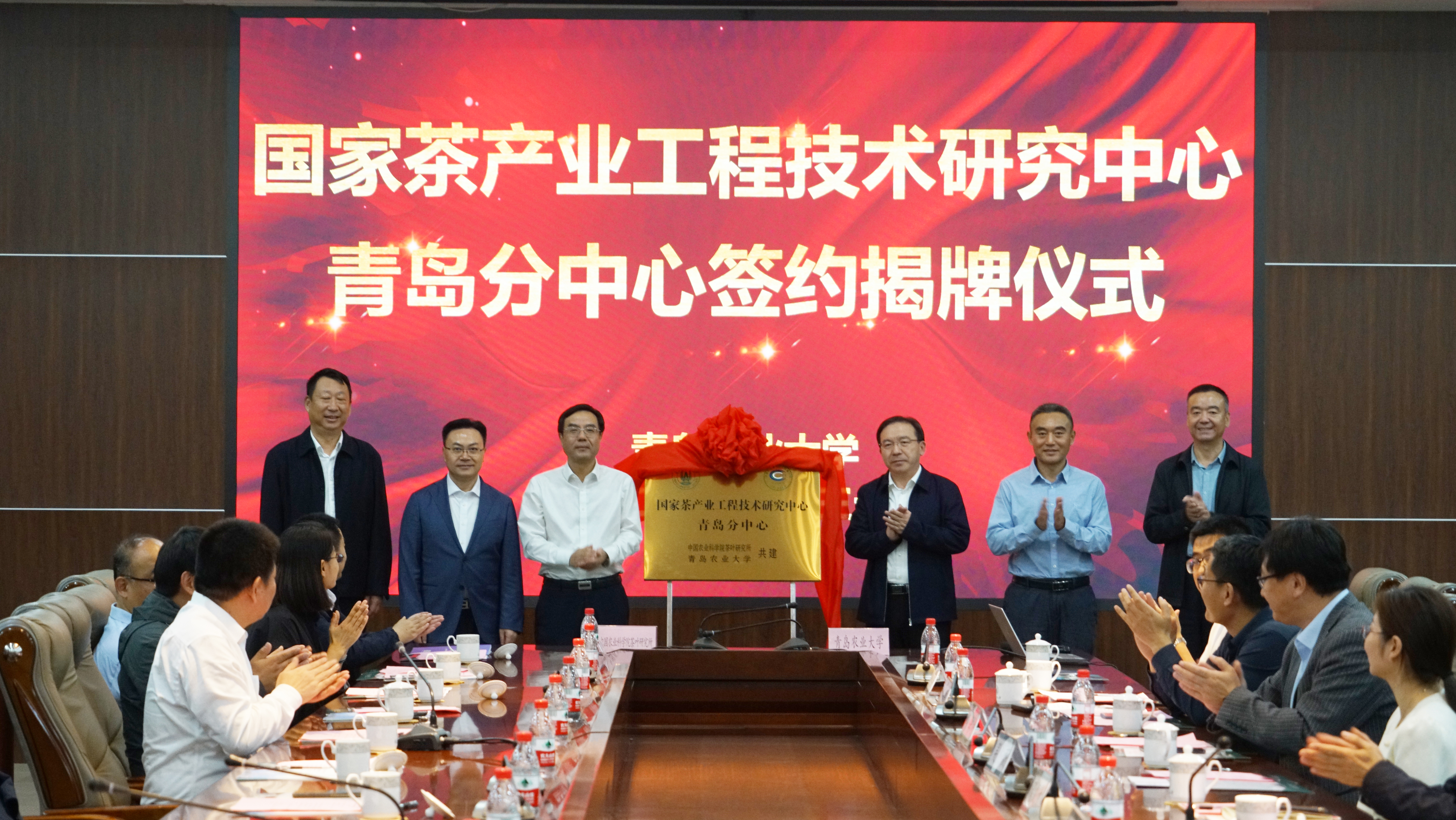 王新超、张忠华签署了“国家茶产业工程技术研究中心青岛分中心”共建协议,刘仲华、姜仁华、杨武杰、赵金山、徐振峰、李月圆共同为“国家茶产业工程技术研究中心青岛分中心”揭牌。姜仁华为九游体育官方网站副院长、山东省茶叶产业技术体系副首席张新富颁发了青岛分中心主任聘书。张新富就目前学校茶学学科的建设情况及青岛分中心工作计划做了汇报。