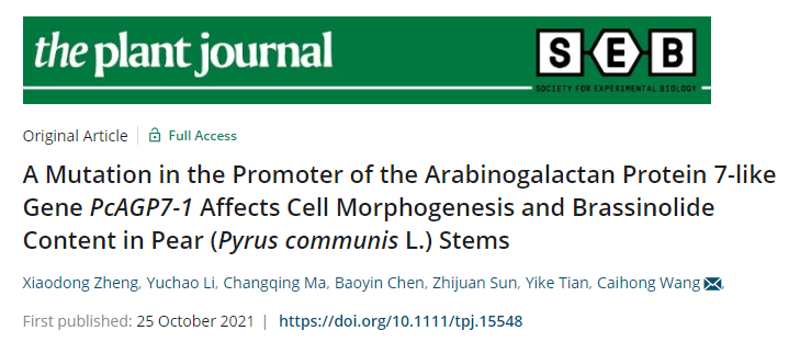 2021年10月25日,九游体育官方网站王彩虹教授课题组在The Plant Journal(Top期刊,IF 6.417)在线发表了题为“A Mutation in the Promoter of the Arabinogalactan Protein 7‐like Gene PcAGP7‐1 Affects Cell Morphogenesis and BrassinolideContent in Pear (Pyrus communis L.) Stems”的研究论文。该研究系统揭示了阿拉伯半乳糖蛋白基因PcAGP7-1启动子上E-box突变影响细胞形态建成及油菜素内酯含量从而导致梨树体矮生表型的分子机制,揭示了BL-BZR/BES-AGP-BL的分子调控网络。本研究为深入研究梨矮生性状分子机制提供了重要依据。九游体育官方网站王彩虹教授为论文的通讯作者,郑晓东副教授,硕士李玉超为论文的共同第一作者,田义轲教授、马长青博士、孙志娟博士等也参与了本研究。