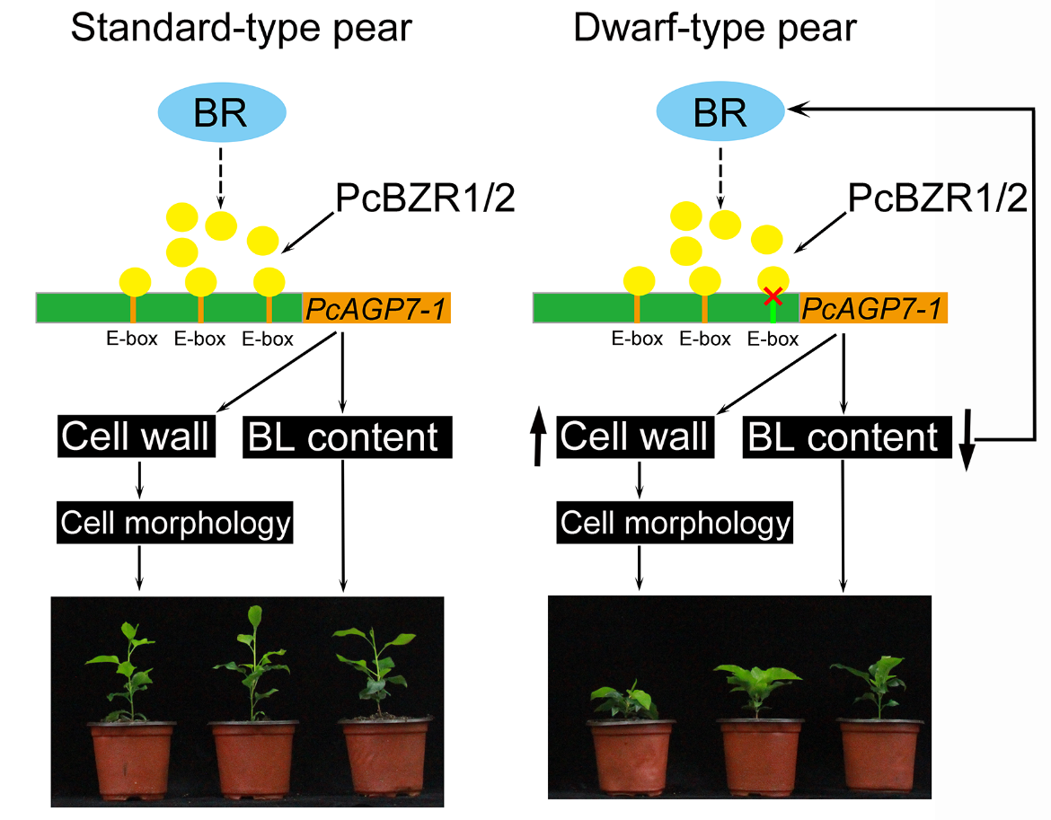 果树矮化栽培因具有早果、丰产、易管理等优点,已经成为现代果园生产的重要模式。培育和利用优质的矮生型果树品种是实现矮化栽培的重要途径。源自西洋梨(Pyrus communis L.)的矮生型实生变异品种‘Le Nain Vert’具有冠形紧凑、树体矮小、枝条节间短等优良性状,是培育矮生型品种的重要种质资源。遗传研究表明,该矮生性状受控于显性基因PcDw,但相关分子机制还不清楚。本研究以目标性状的分离群体为试材,分别从矮生型和普通型梨中克隆了PcDw的候选基因PcAGP7-1的启动子序列,发现矮生型梨中PcAGP7-1启动子上E-box的缺失是导致该基因转录水平显著升高的根本原因。本研究进一步揭示了BR信号转导途径中重要转录因子PcBZR1/2可以通过直接结合PcAGP7-1启动子上的E-box抑制PcAGP7-1基因的表达。因此,矮生梨中E-box的缺失减少了PcBZR1/2对PcAGP7-1转录的抑制作用,从而提高了PcAGP7-1在矮生型梨中的表达水平。PcAGP7-1的高表达一方面可以使细胞壁加厚,改变细胞形态结构,导致茎节间变短,另一方面还可以减少茎中的BL含量,形成负反馈机制,进一步降低PcBZR1/2对PcAGP7-1表达的抑制作用,使茎变短。本研究最终揭示了一条BL-BZR/BES-AGP-BL调控梨树体矮生的分子机制。