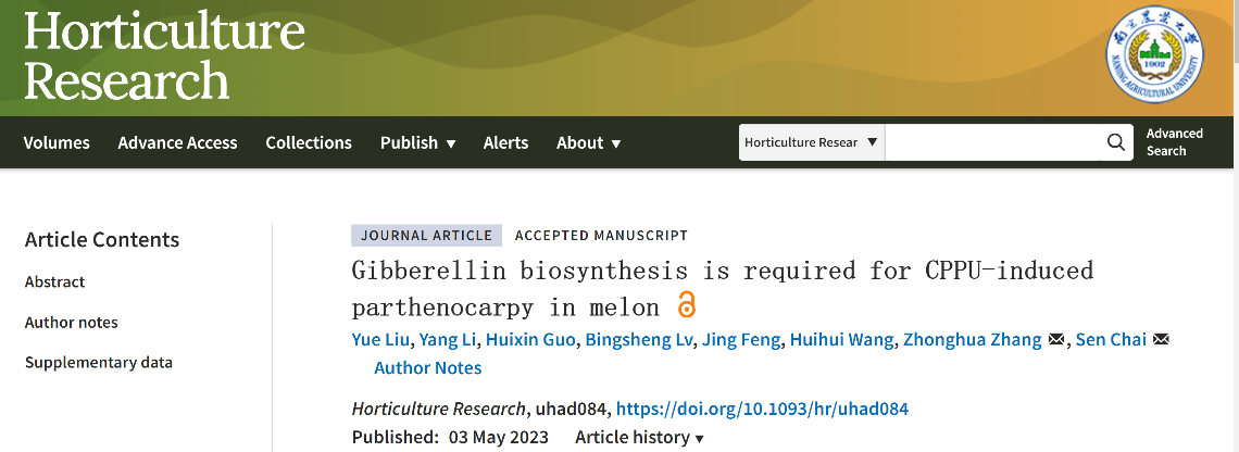 2023年5月,Horticulture Research发表了九游体育官方网站瓜类生物研究团队题为 Gibberellin biosynthesis is required for CPPU-induced parthenocarpy in melon的研究论文。该研究初步探讨了CPPU诱导甜瓜果实单性结实的分子机制,为解决甜瓜生产中的坐果问题、种质改良以及单性结实的机制研究提供理论依据。
