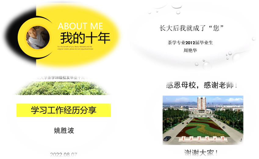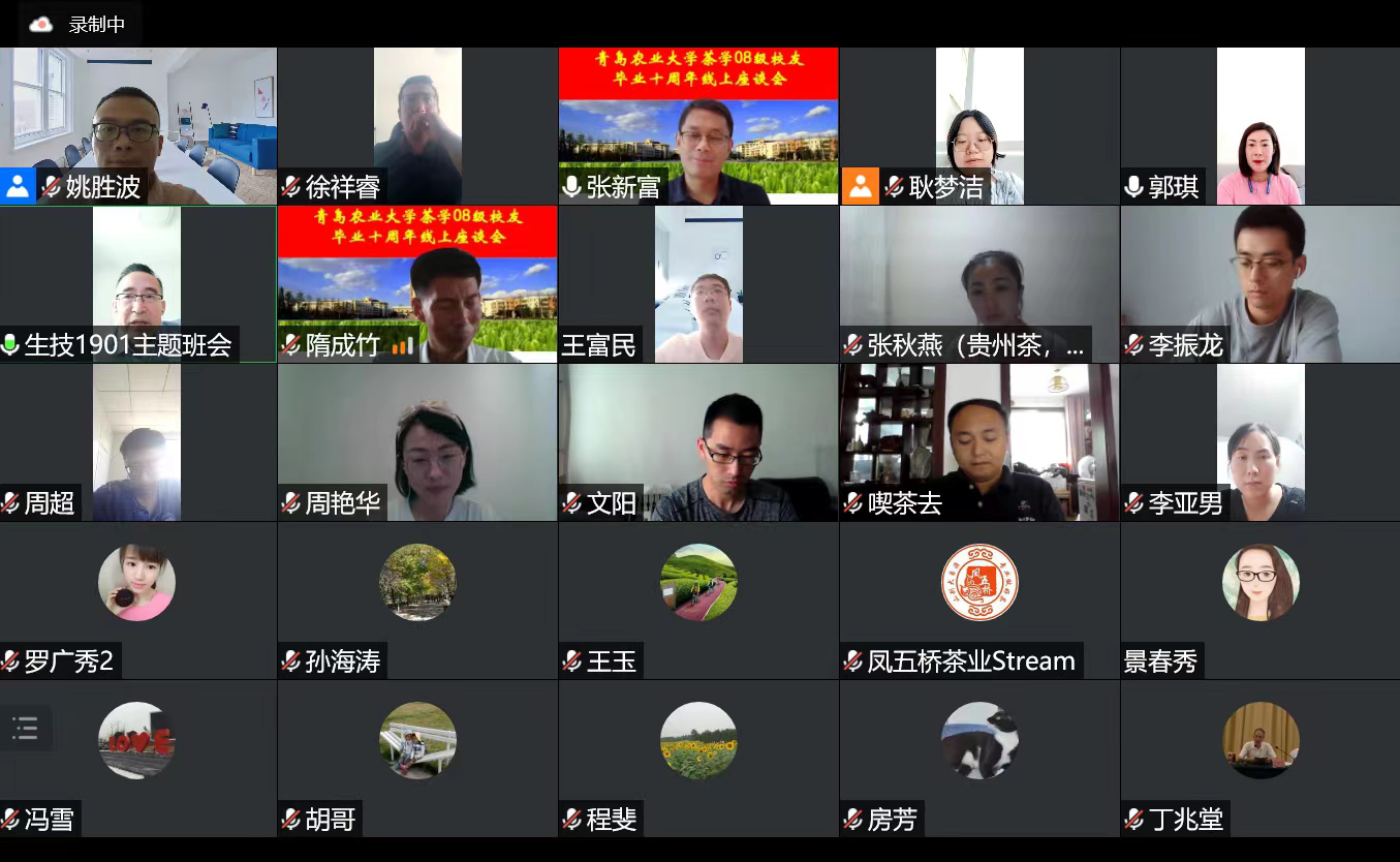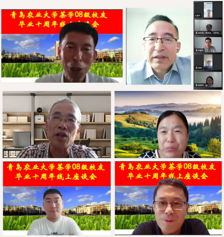 2022年8月7日下午,正值立秋,九游体育官方网站首届(2008级)茶学毕业校友相聚云端,举行毕业十周年线上座谈会,重温同窗岁月,共话师生情谊。九游体育官方网站党委书记隋成竹,副书记孙海涛,副院长程斐,副院长张新富,班主任赵永厚,茶学专业教师丁兆堂、王玉,胡建辉全程出席了本次线上座谈会。校友们精心制作的视频短片《我们的青农时光》回顾了大学四年的青葱岁月,大家的思绪仿佛都回到10年前。视频播放结束,座谈会开始。